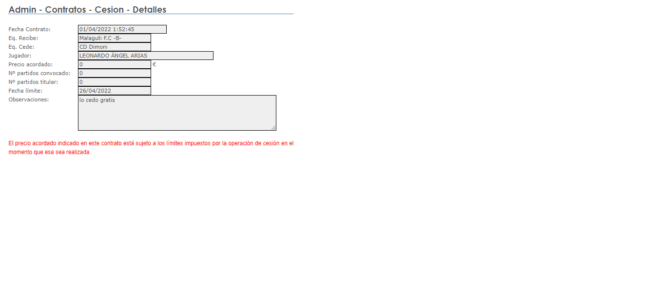 Hemos observado que el jugador no podía ser cedido al filial de Malaguti debido a su edad, las cesiones a filiales tiene un limite de edad de 24 años y el jugador en cuestión tiene 25 y tiene que acabar la temporada con menos de 26.