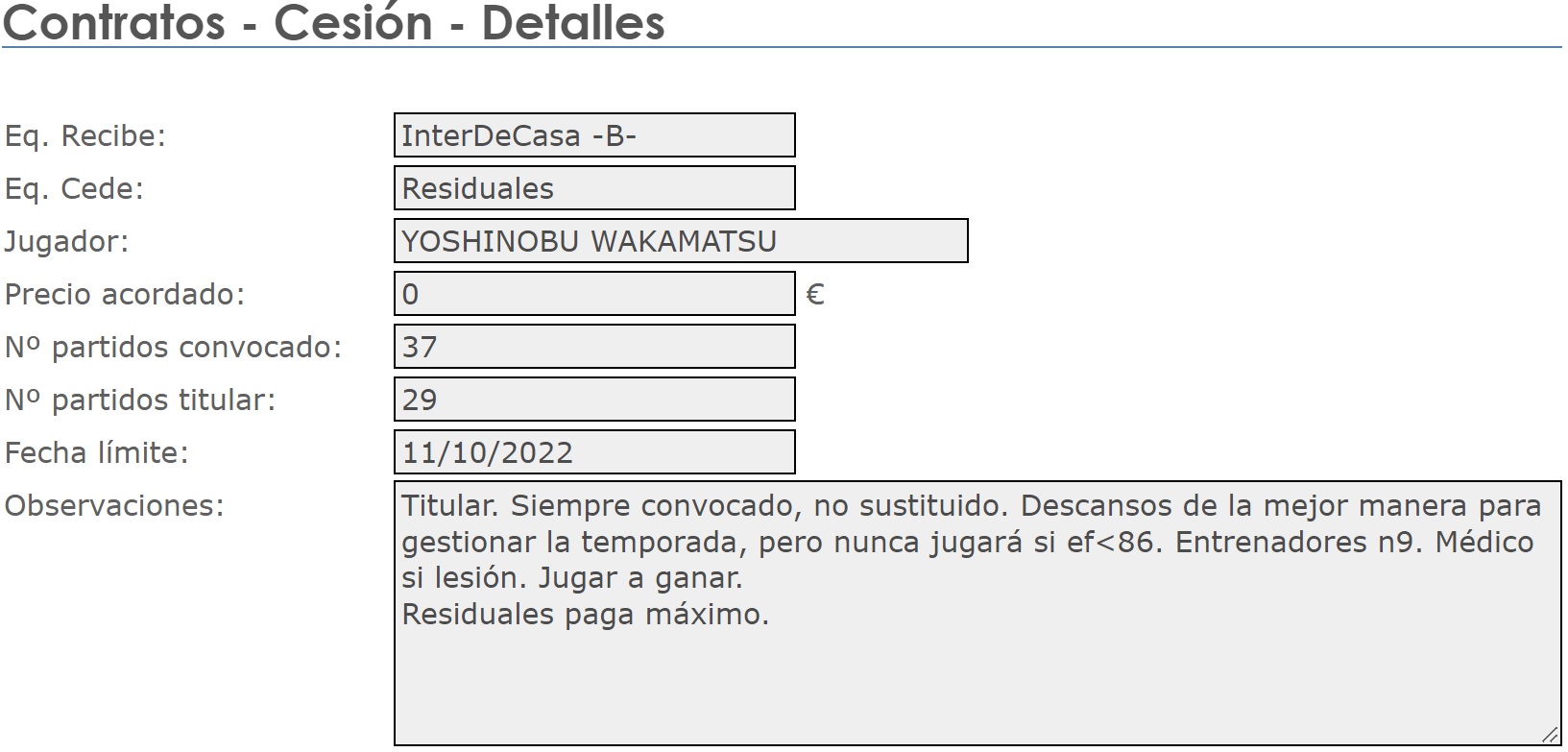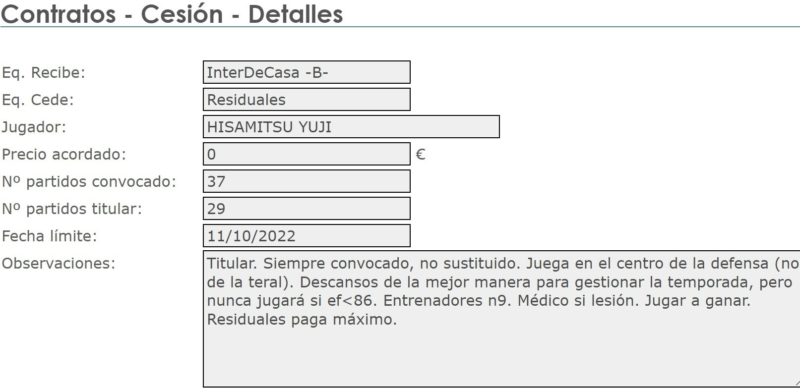 Quiero denunciar el incumplimiento de 3 contratos con el mismo equipo, así como su devolución e indemnización. Lo solicito antes de la jornada 5, para evitar subida de ficha en la recuperación. A pesar de avisarle y haberse conectado, no he tenido ni respuesta ni acciones para cumplir los acuerdos. JUGADOR 1: HISAMITSU YUJI OFERTA DE CESIÓN NO REALIZADA. Fecha fin 11/10. ![]() JUGADOR 2: MAMEXI PEREDO. INCUMPLIMIENTO DE CONDICIONES DE CONTRATO. No lo pone de titular aunque tiene 95ef. No juega a ganar. No contrata entrenadores. ![]() JUGADOR 3: YOSHINOBU WAKAMATSU. INCUMPLIMIENTO DE CONTRATO. Juega fuera de zona de influencia. No contrata entrenadores. No juega a ganar. ![]() Gracias y un saludo.