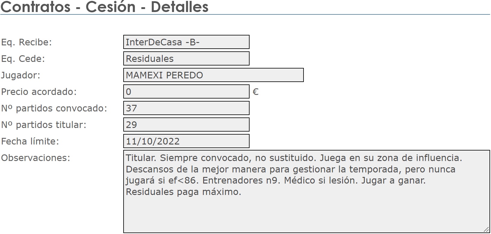 por alusión, paso por aquí. Uno de los tres jugadores, el sistema no me deja solicitar la cesión ya que estoy en quinta división y dicho jugador supera la media máxima permitida (al intentar solicitar la cesión del mismo es el mensaje que aparece en el sistema). Por otra parte el usuario me comenta que debo contratar entrenadores de nivel 9 cuando antes de realizar el contrato no se me comentó nada. Error mío al no leer el contrato que me mandó. Sí dicho incumplimiento significa que debo devolver los dos jugadores cedidos y el dinero recibido sin problema, pido disculpas por no haberme dado cuenta (llevo poco con el filial). Un saludo.