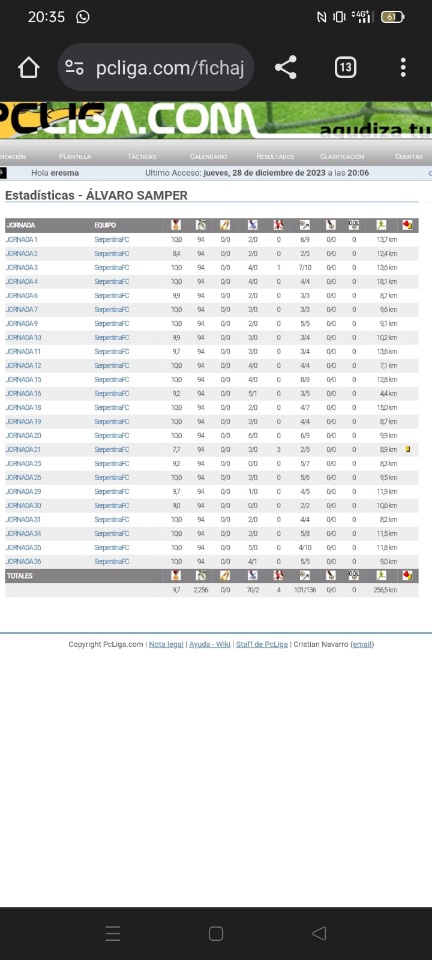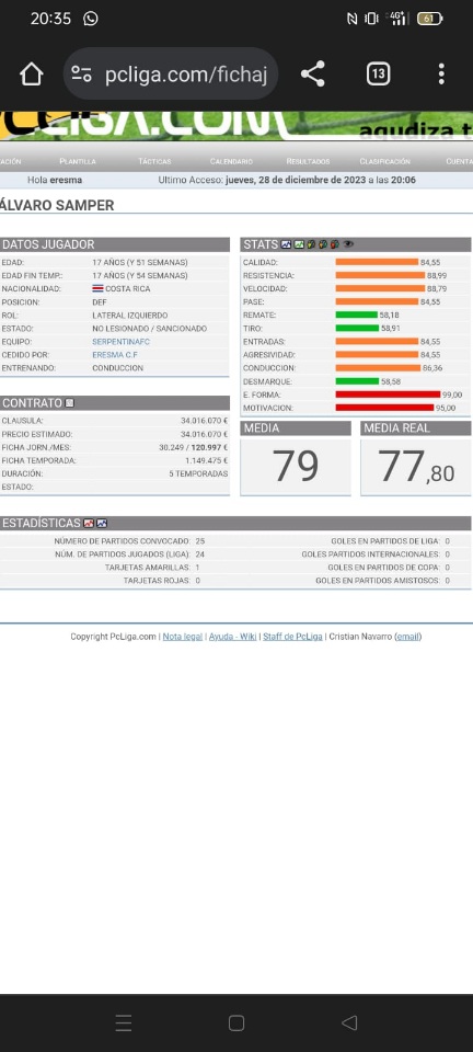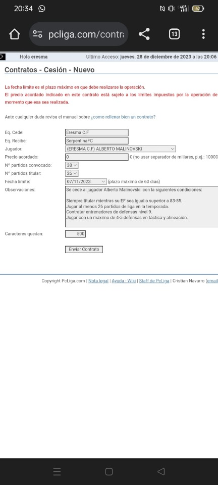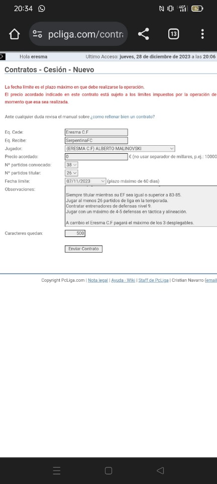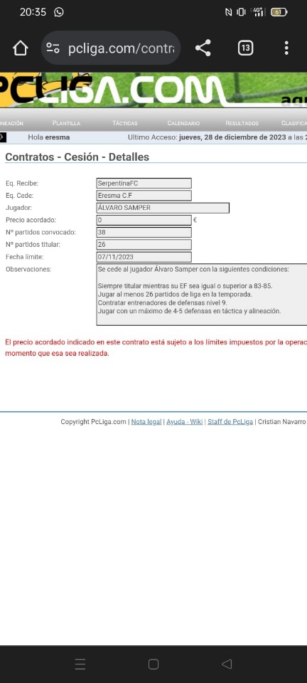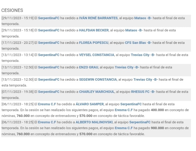 Querría denunciar por incumplimiento de contrato de cesión al SerpentinaFC. En los contratos estaba estipulado que serían convocados 38 partidos y jugarían 26 partidos de liga. Ninguno de los jugadores ha llegado a los partidos de liga que marcan los contratos y uno de los jugadores no ha sido convocado en 13 partidos. Avise al manager de que no estaba convocando al jugador y siguió igual. El perjuicio en la progresión de mis jugadores en el reset va a ser grande. Tengo pantallazos de todo, pero no me deja subirlos, contratos de cesión, pagos por las cesiones y estadísticas de los jugadores acabada la liga/estadísticas de la temporada. Es la primera vez que me veo obligado a denunciar... Si tengo que hacer algo más decidme, gracias! Ruli545: edito para subir las capturas q me paso ya q él no pudo